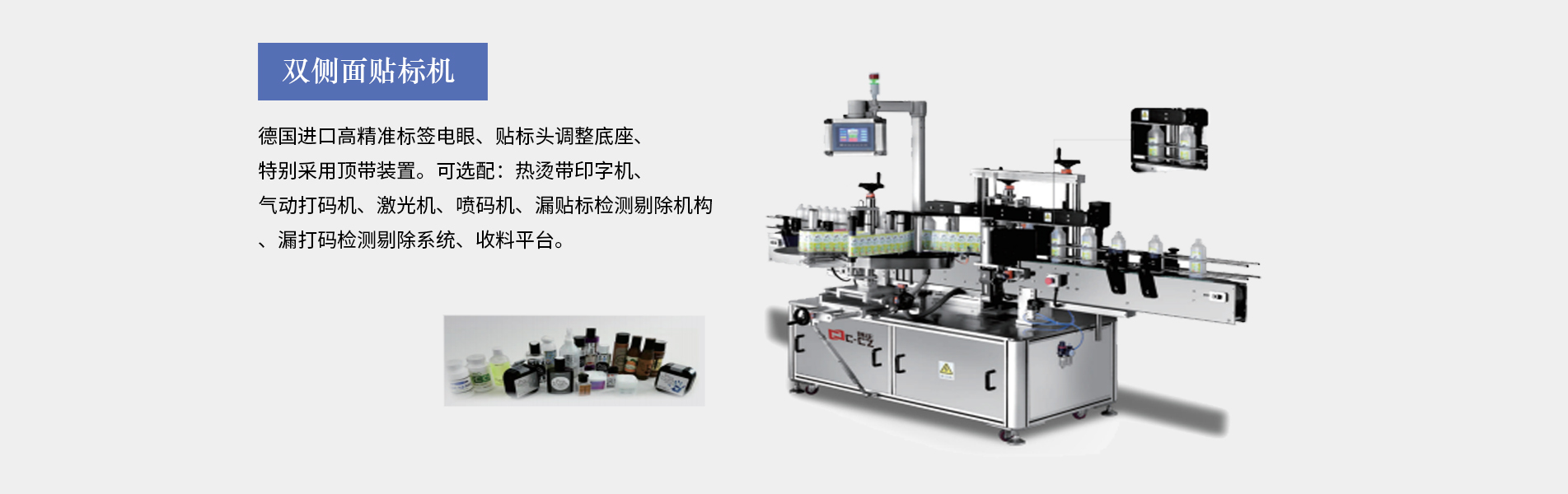 本公司生產(chǎn)的口服液貼標(biāo)機(jī)適合細(xì)長(zhǎng)形圓柱體瓶圓周表面的不干膠標(biāo)簽自動(dòng)貼標(biāo),口服液瓶等,采用彩色人機(jī)界面,離合器設(shè)計(jì),使標(biāo)簽張緊力更加穩(wěn)定,便于提高貼標(biāo)精度3、西門子PLC控制,德國(guó)、日本光眼,高精度步進(jìn),貼標(biāo)速度可達(dá)30米/分鐘,可加裝色帶打碼機(jī)、或者熱轉(zhuǎn)印機(jī)。口服液貼標(biāo)機(jī)多為圓瓶貼標(biāo)機(jī)適用于瓶身長(zhǎng),直徑的產(chǎn)品(玻璃塑料都可以,材質(zhì)不限),同時(shí)可加工粉針劑瓶、采血管、水針劑瓶、眼藥水瓶、圓管等,專門針對(duì)...
